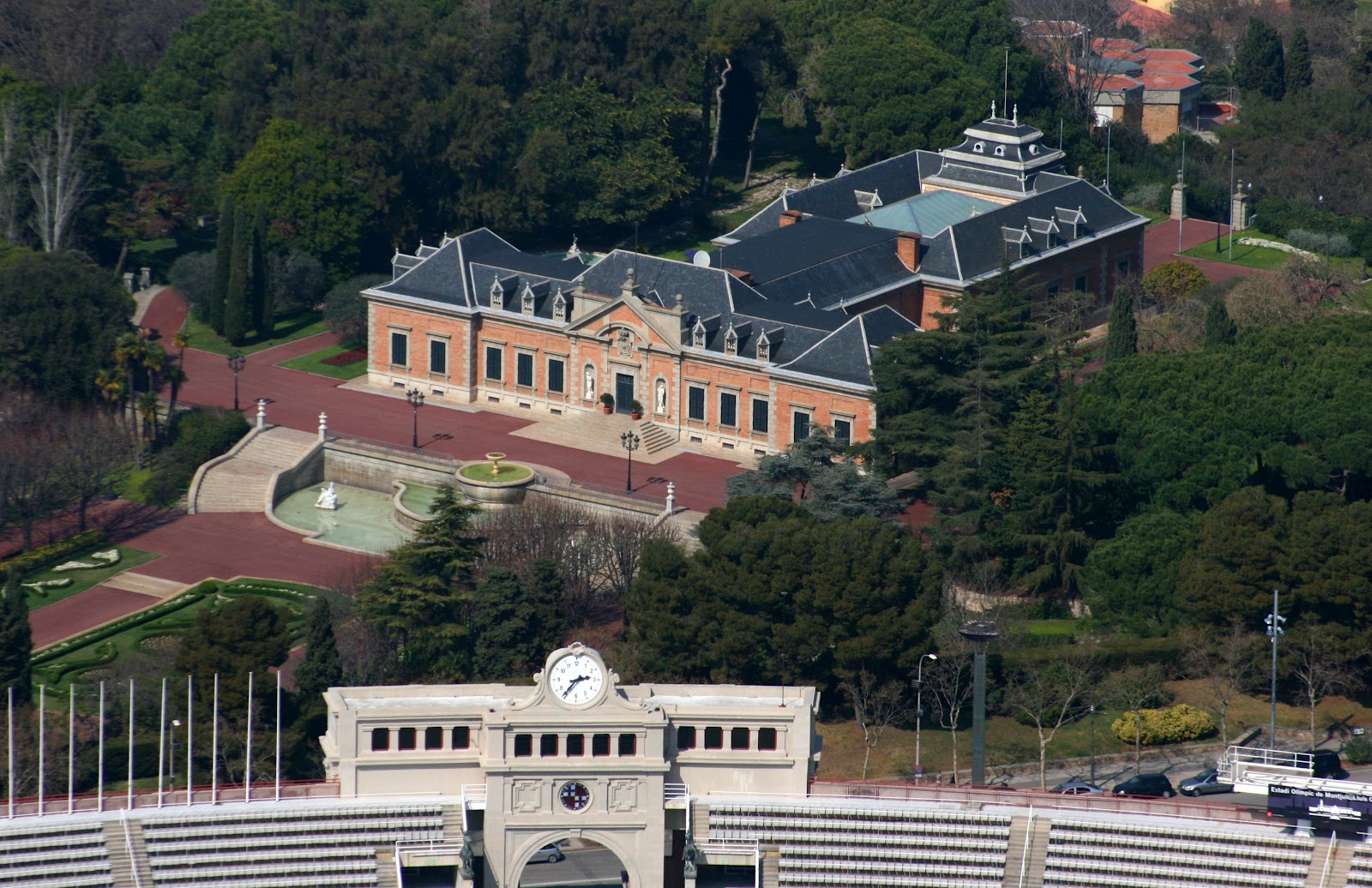Fue construido en 1928 por los arquitectos Joan Moya y César Martinell para la Exposición Internacional que iba a celebrarse al año siguiente. Es de inspiración neoclásica y en su interior destaca una pintura mural de Dalí y la colección de tapices de la Sala Goya. Los dos leones esculpidos que se encuentran a la entrada del palacete proceden del Palacio de Pedralbes. Únicamente se pueden visitar los jardines.